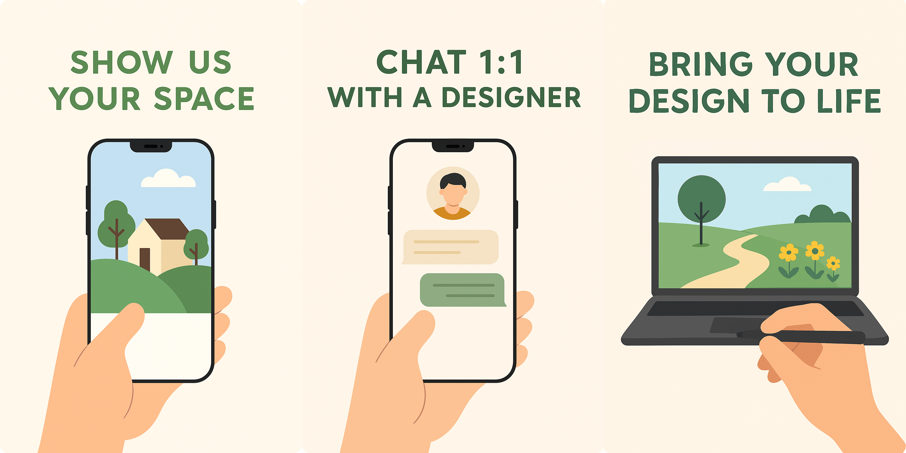 Select your preferred design package and share photos or videos of the areas you’d like us to transform. Once we receive your materials, one of our professional designers will contact you to discuss every detail of your project.